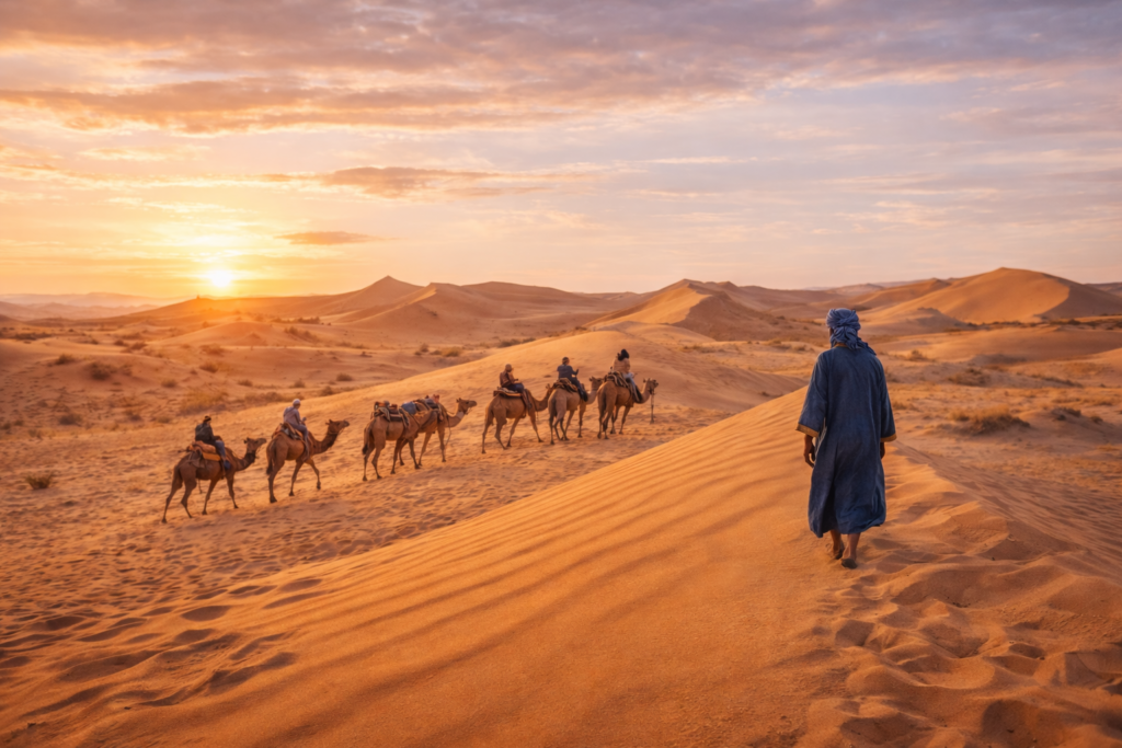 Nomade Dune Tours propose une sélection de circuits conçus pour offrir une immersion authentique dans le désert marocain. Randonnées à dos de dromadaire, nuits sous les étoiles, moments de vie nomade et rencontres avec les habitants rythment chaque itinéraire à travers les plus beaux paysages du sud.